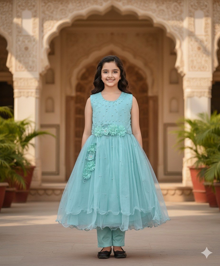 This enchanting aqua blue sleeveless dress, adorned with delicate pearl accents and elegant floral detailing around the waist, offers a refreshing and graceful look. Paired with matching bottoms, this ensemble is perfect for festive gatherings, formal events, or any occasion where your little one wants to exude calm sophistication and charm.