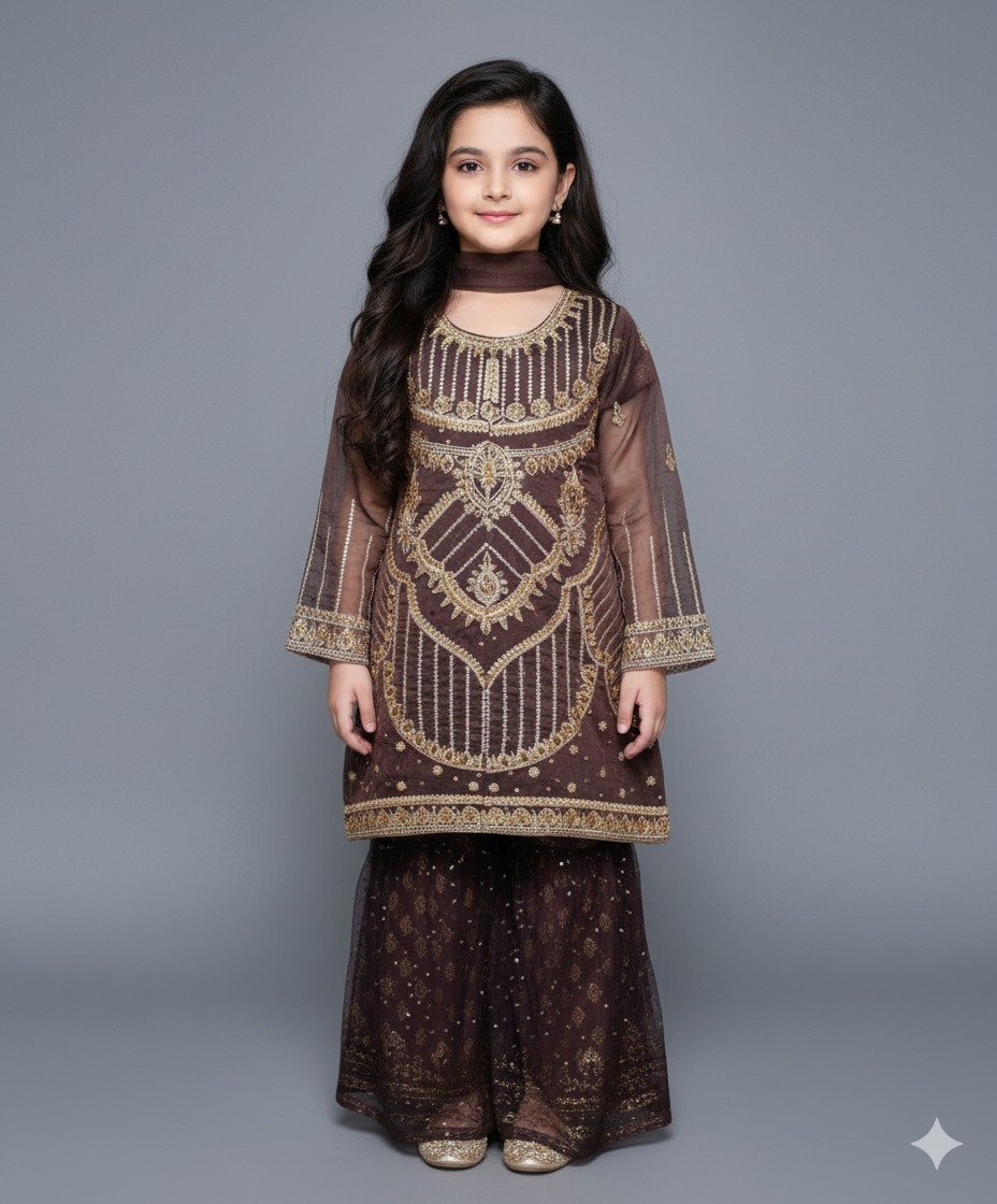 A luxurious Espresso brown three-piece traditional ensemble for girls, perfect for weddings, formal dinners, Eid celebrations, or festive events. This opulent set features a short kurta adorned with intricate gold Dabka embroidery and shimmering patterns. It is perfectly paired with a matching flared Gharara with gold foil accents, and a coordinating choker, creating a truly grand and elegant look