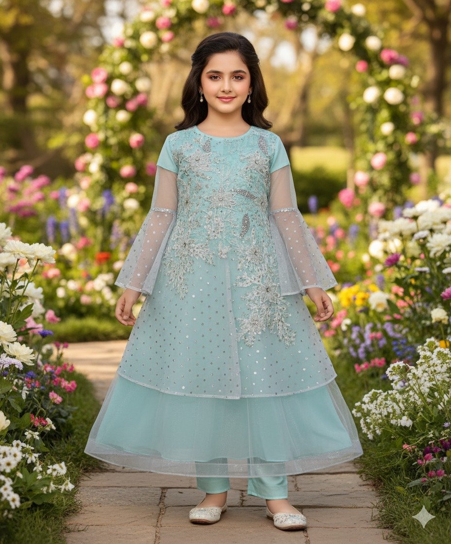 An enchanting Aqua green three-piece ensemble for girls, perfect for weddings, formal parties, Eid celebrations, or special occasions. This captivating outfit features a layered tiered frock with intricate silver embroidery and shimmering dewdrop embellishments on the bodice and top layer. It is complemented by sheer, wide bell sleeves with delicate silver accents and matching slim trousers, creating a truly ethereal and graceful look.