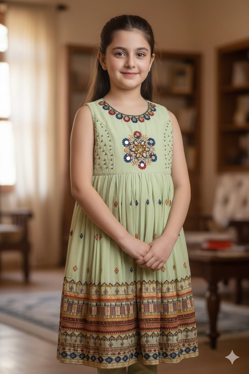 A bright girls’ summer dress in light pistachio green. Features intricate mirror work and colorful embroidery around the neckline, paired with a soft, flowing skirt detailed with a bold ethnic print border. This comfortable sleeveless dress is perfect for summer parties, casual festivities, and everyday cheerful style.