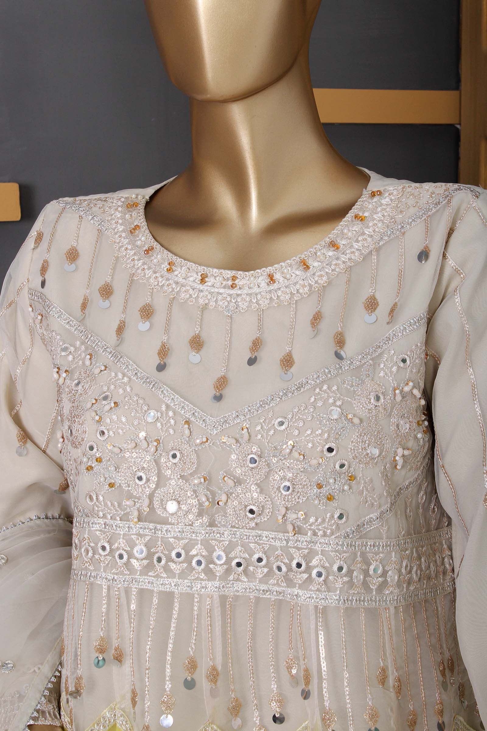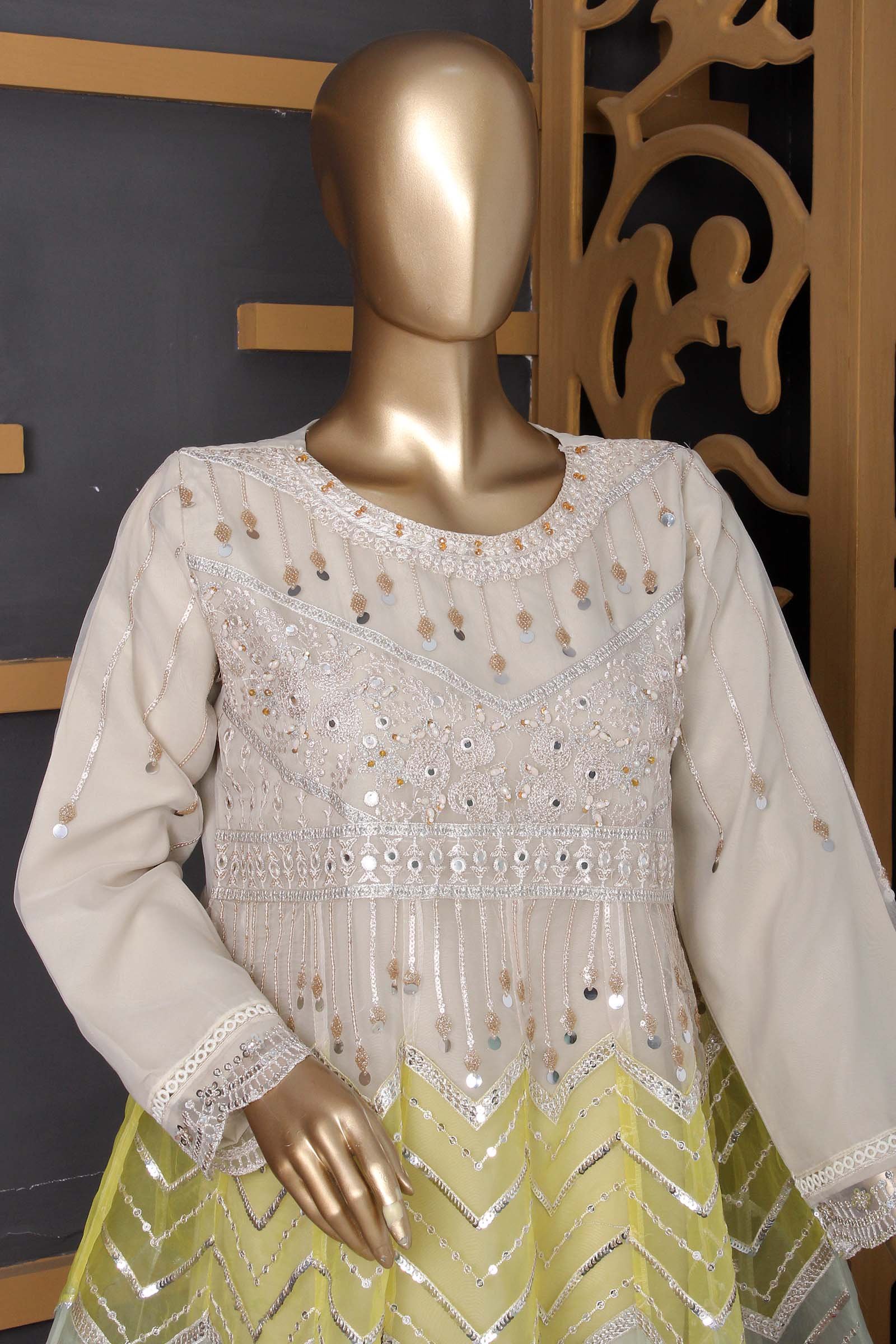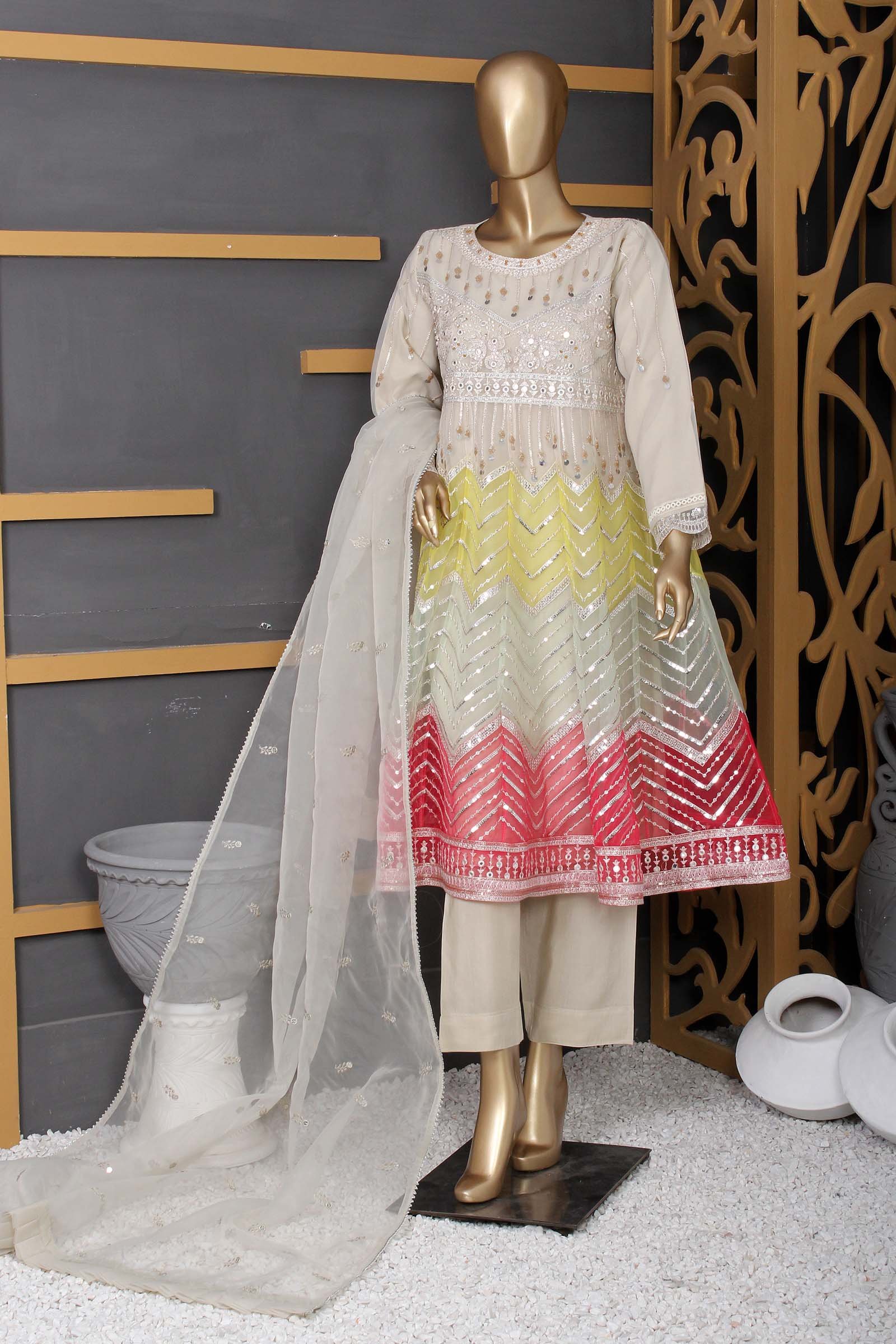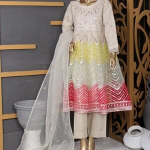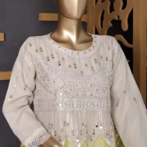 Beautifully crafted embroidered organza frock adorned with intricate mirror embroidery and hand embellishments. Comes with a matching embroidered organza dupatta and comfortable viscose trousers. Elevate your style effortlessly with this stunning ensemble.