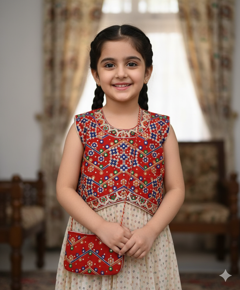 This stunning traditional ensemble features a richly embroidered sleeveless red top adorned with colorful floral and geometric patterns, paired with a flowing, off-white skirt embellished with delicate multi-colored motifs. Complete with a matching small purse, this vibrant outfit is perfect for festive celebrations, cultural events, or adding a touch of lively charm to your little one’s special occasions.