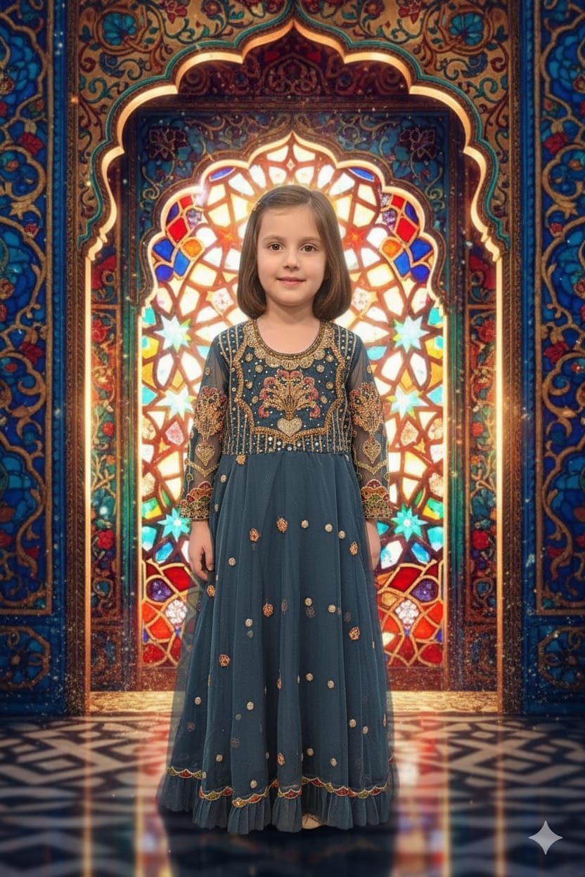 An exquisite girls’ full-length gown in deep Indigo (Teal/Peacock). This traditional long sleeve dress features ornate, multi-color embroidery in a floral motif across the bodice and cuffs. With a flowy net skirt, this Heirloom-quality gown is perfect for weddings, formal family gatherings, and high-end festive events.