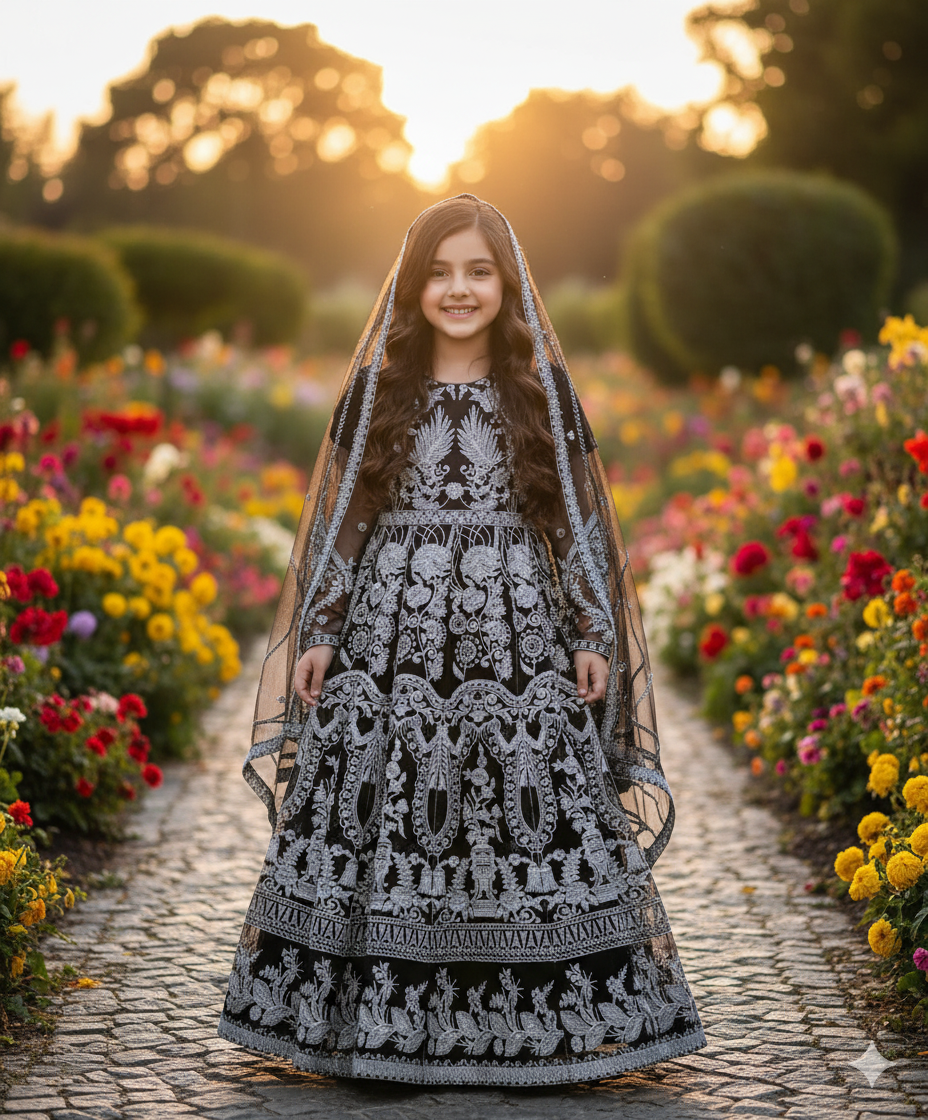 A magnificent Black three-piece traditional ensemble for girls, perfect for grand weddings, formal receptions, Eid celebrations, or special events. This opulent Pishwas features exquisite silver Kashmiri embroidery and intricate patterns spanning the entire long frock. It is complemented by sheer full sleeves and a matching dupatta (scarf) draped elegantly, creating a truly regal and captivating look.