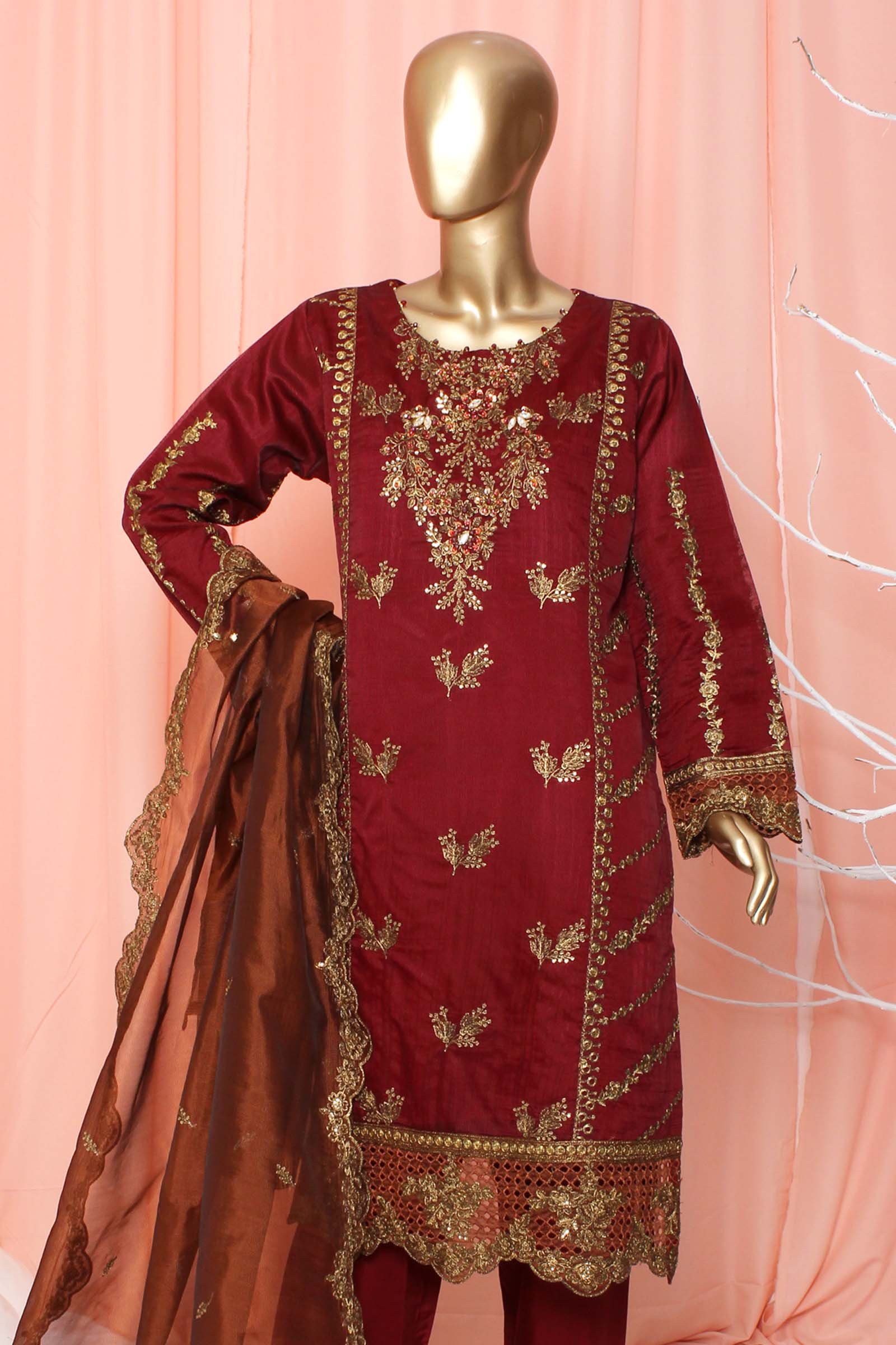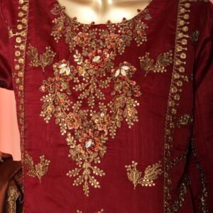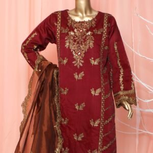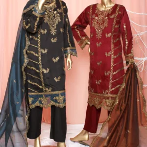 “Enhance your wardrobe with our exquisite khaddi net ensemble, featuring intricate embroidery on the shirt and a beautifully detailed dupatta with cutwork border. Complete the look with a fine viscose trouser for effortless elegance.”