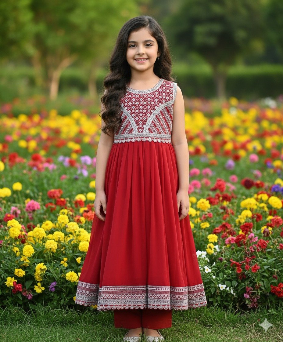 A radiant Red sleeveless traditional ensemble for girls, featuring a flowy Kalidar-style frock and matching trousers. The bodice and border are adorned with exquisite silver embroidery in a geometric pattern, making it ideal for festive events, weddings, or grand parties. This vibrant Crimson outfit ensures a captivating and comfortable look for your little one.